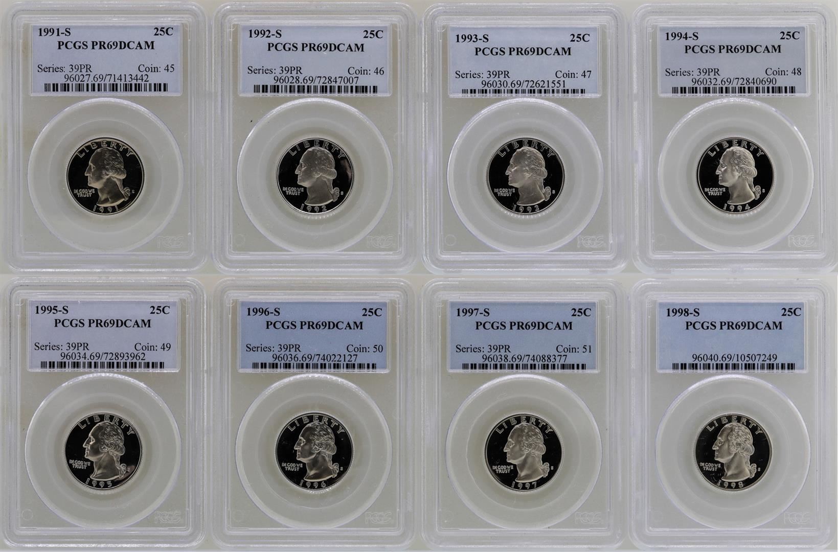 Lot of 1991-S to 1998-S Proof Silver Washington Quarter Coins PCGS PR69DCAM