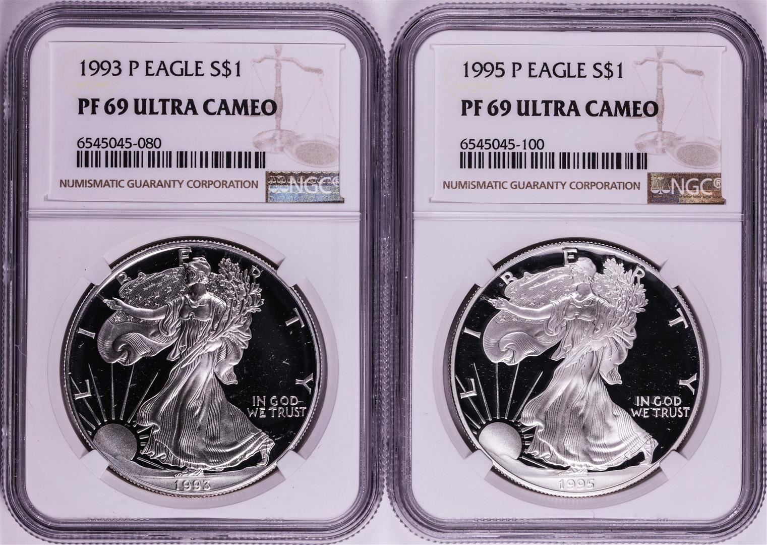 One Lot of 1993-P & 1995-P $1 Proof American Silver Eagle Coins NGC PF69 Ultra Cameo. NGC Certified.