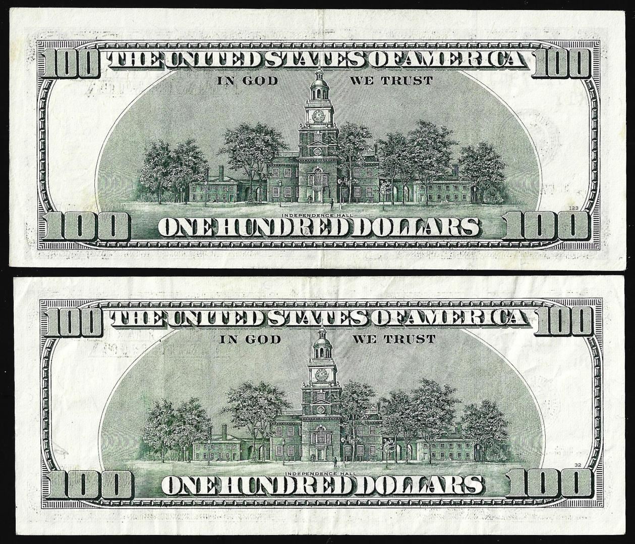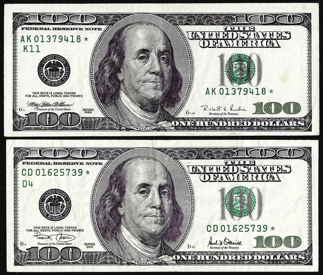 One Lot of 1996 & 2001 $100 Federal Reserve Star Notes.