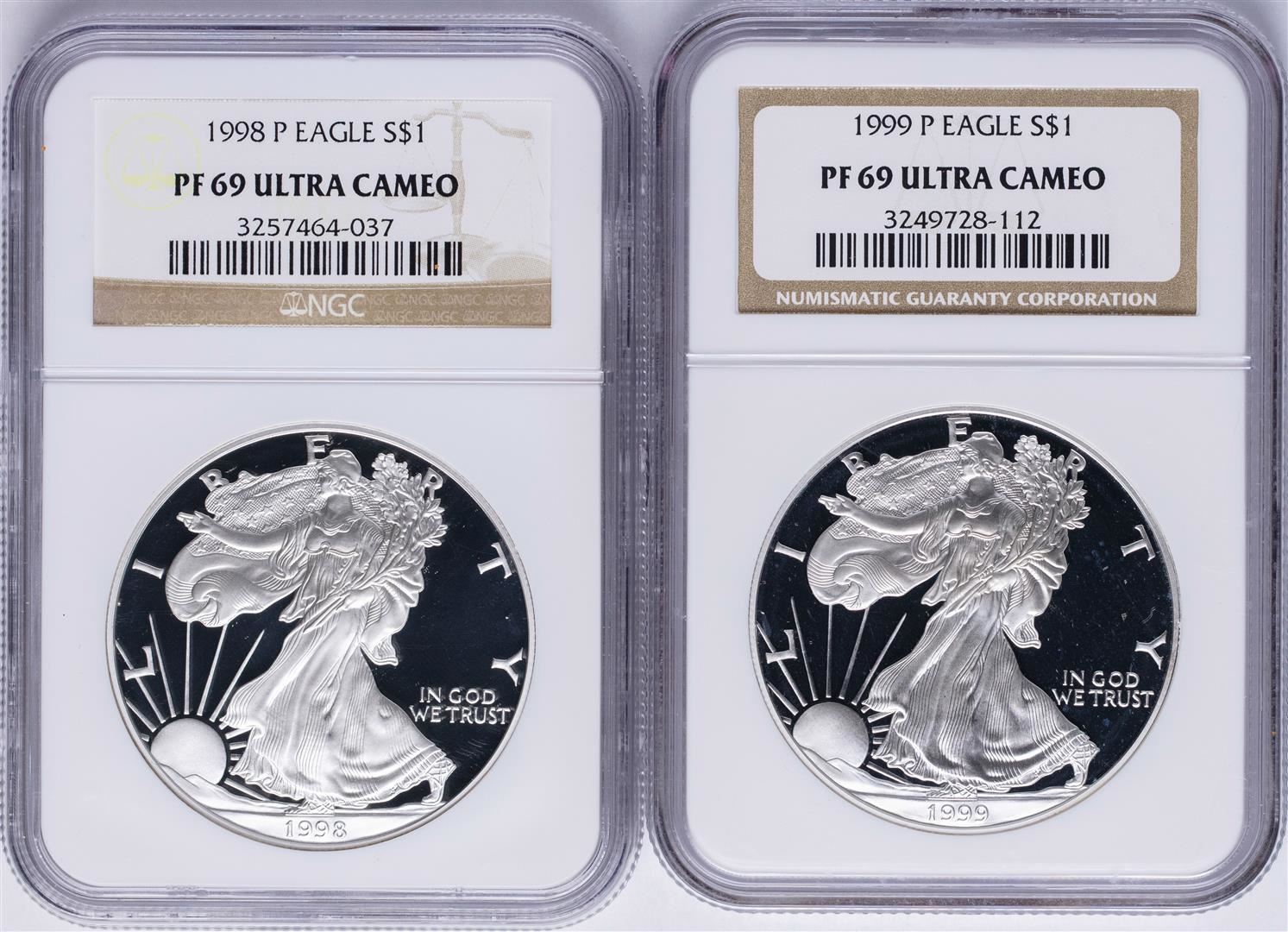 One Lot of 1998-P & 1999-P $1 American Silver Eagle Proof Coins NGC PF69 Ultra Cameo. NGC Certified.