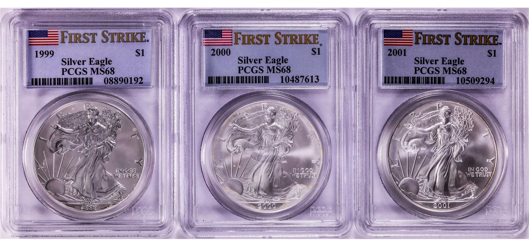 Lot of 1999-2001 $1 American Silver Eagle Coins PCGS MS68 First Strike