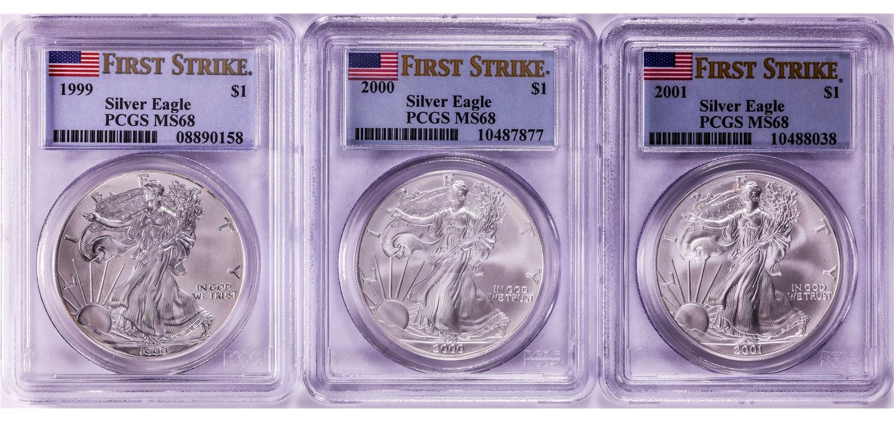 One Lot of 1999-2001 $1 American Silver Eagle Coins PCGS MS68 First Strike. PCGS Graded.