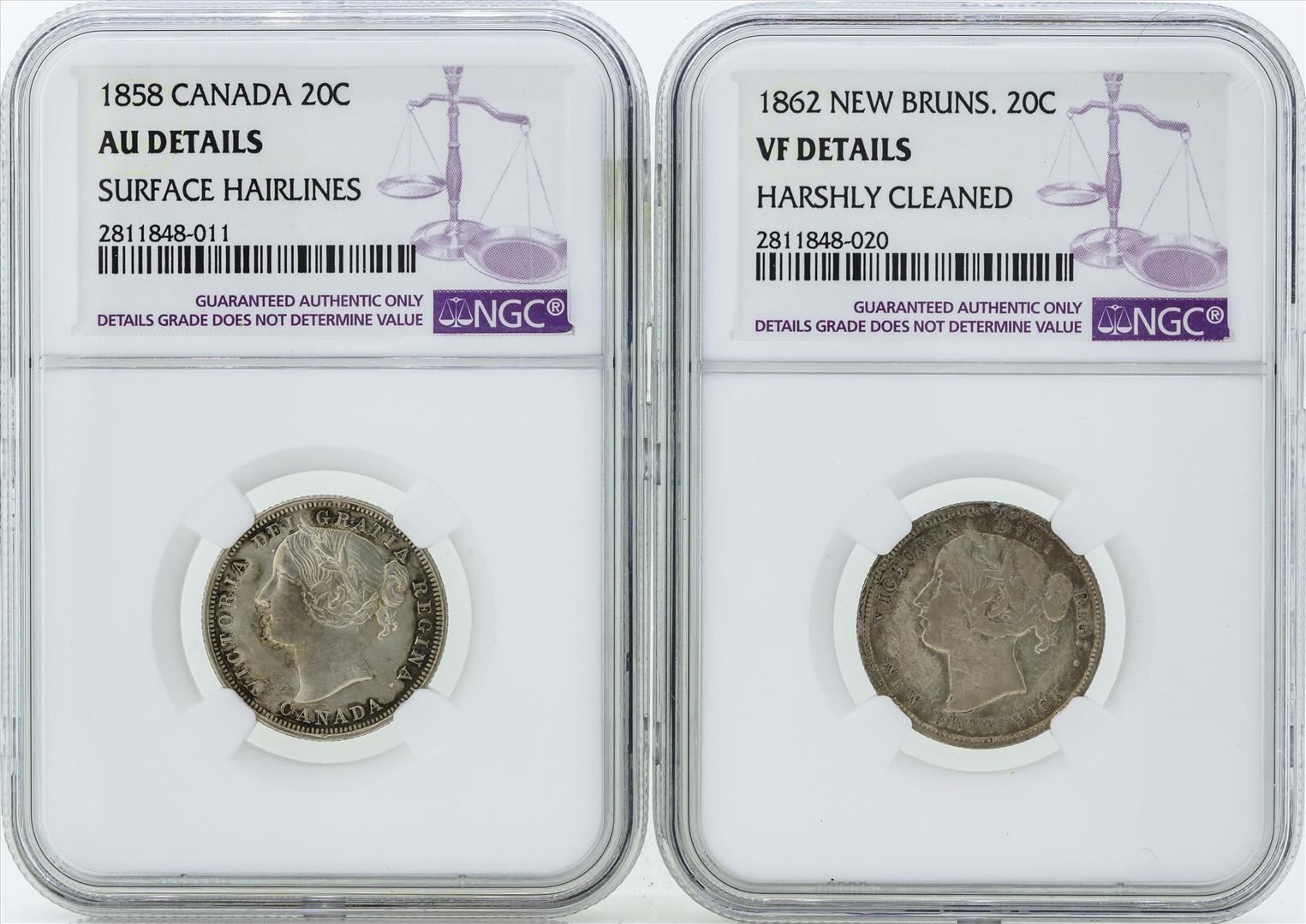 One Lot of (2) 1858 Canada 20 Cent Coin NGC AU Details and 1862 New Bruns. 20 Cent Coin VF Details. NGC Certified.