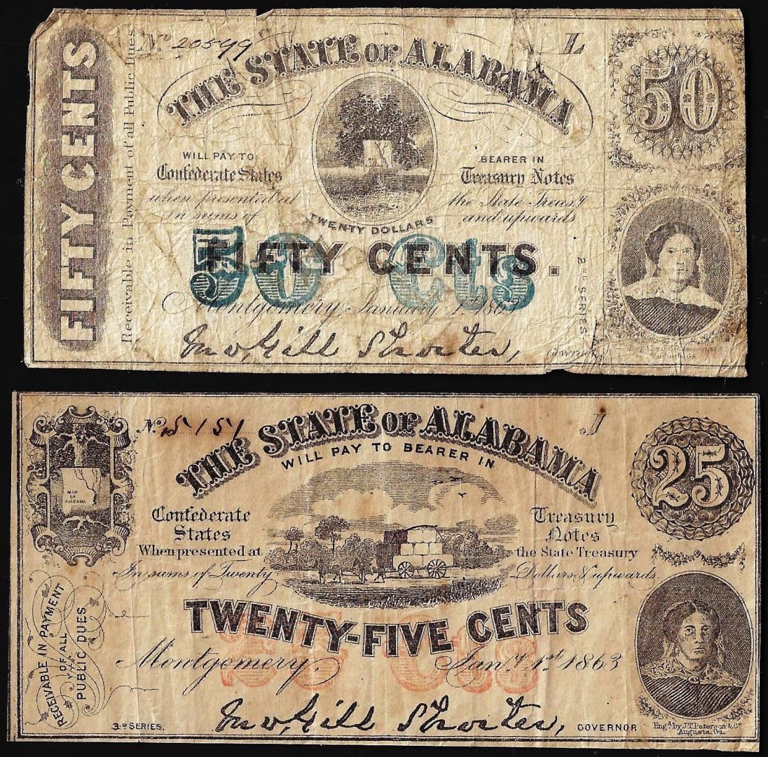 One Lot of (2) 1863 25/50 Cents State of Alabama, Montgomery Obsolete Notes.