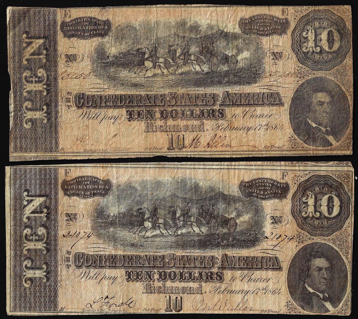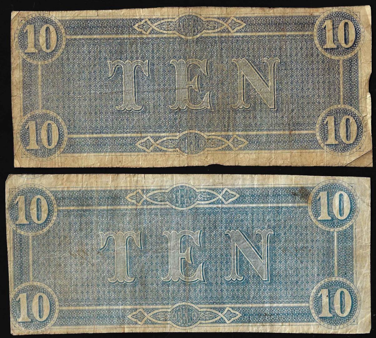 One Lot of (2) 1864 $10 Confederate States of America Notes.