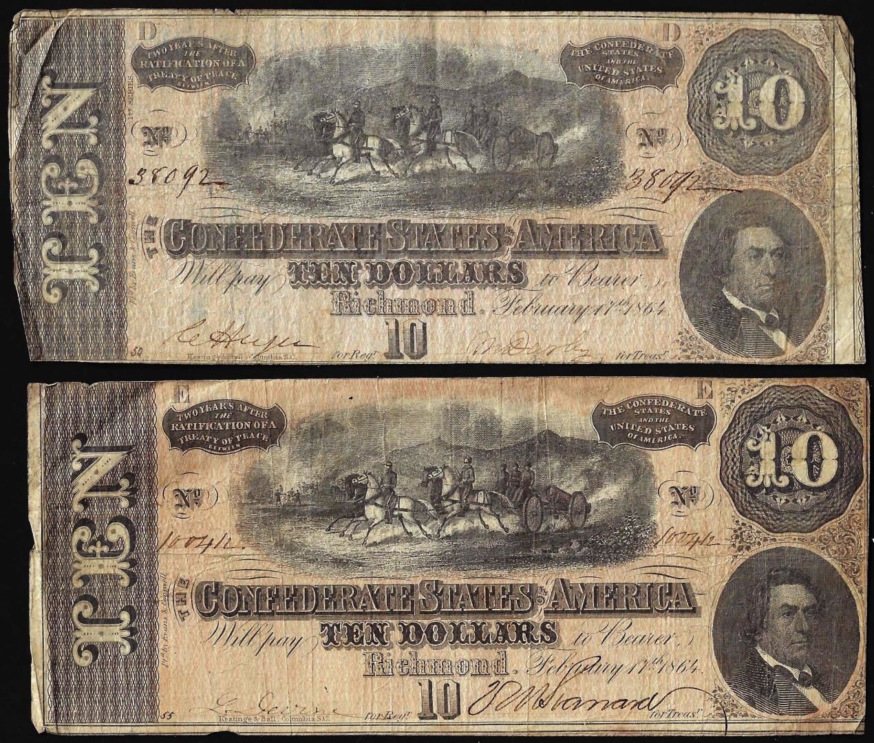One Lot of (2) 1864 $10 Confederate States of America Notes.