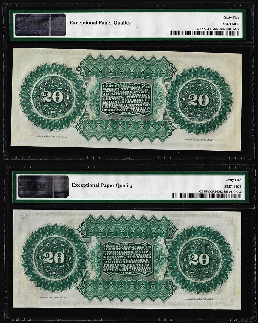 One Lot of (2) 1872 $20 State of South Carolina Obsolete Note PMG Gem Uncirculated 65EPQ. PMG Certified.