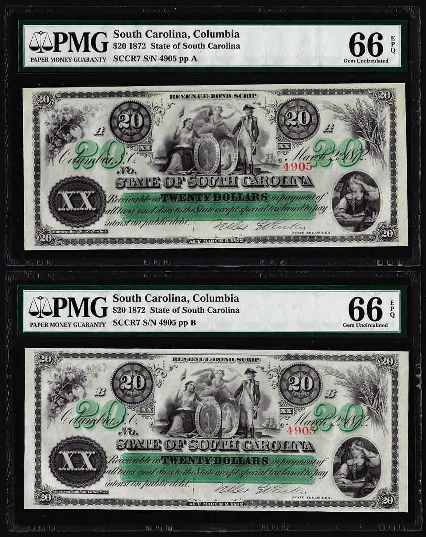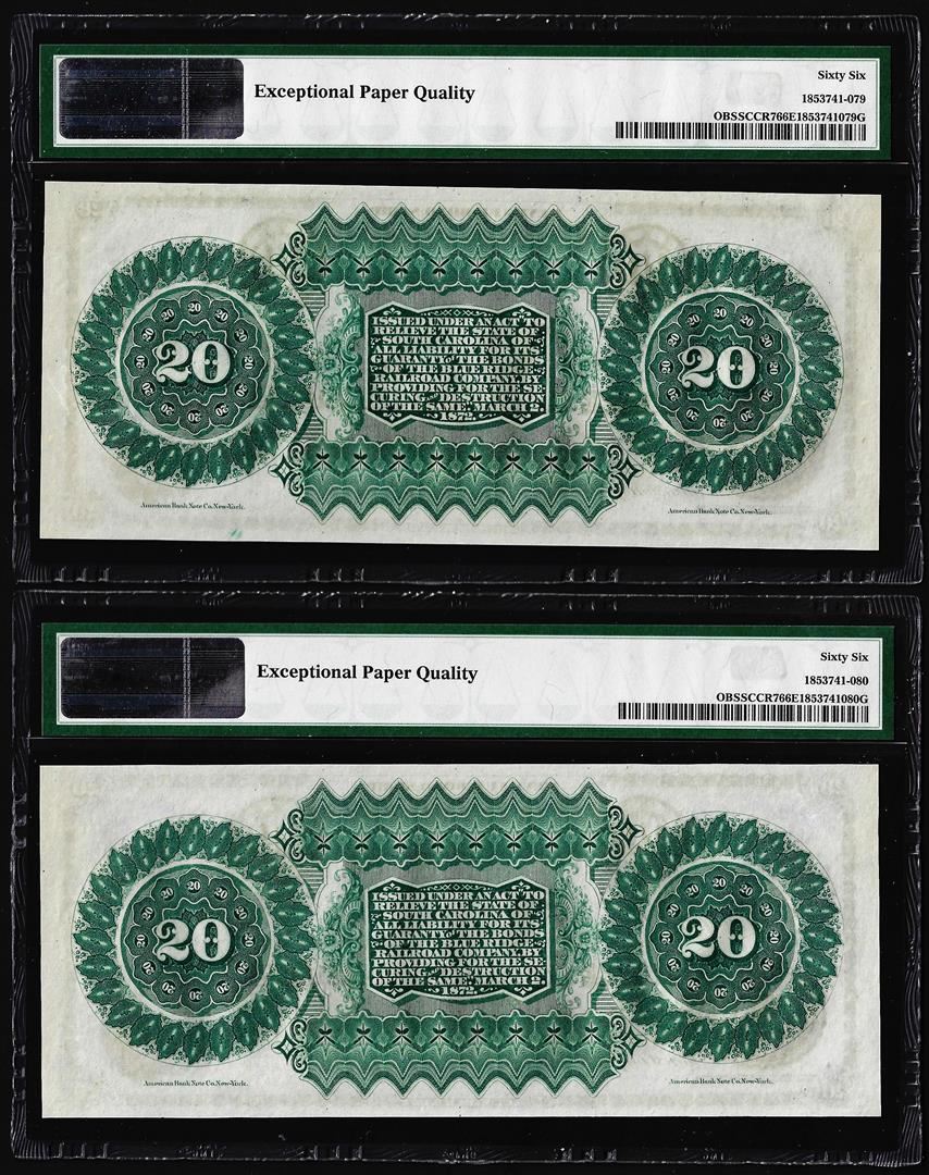 One Lot of (2) 1872 $20 State of South Carolina Obsolete Note PMG Gem Uncirculated 66EPQ. PMG Certified.