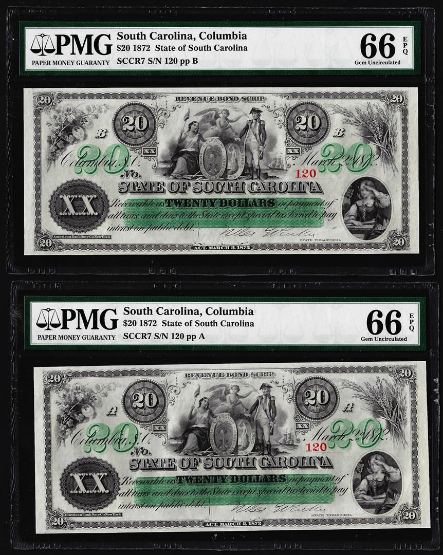 One Lot of (2) 1872 $20 State of South Carolina Obsolete Note PMG Gem Uncirculated 66EPQ. PMG Certified.