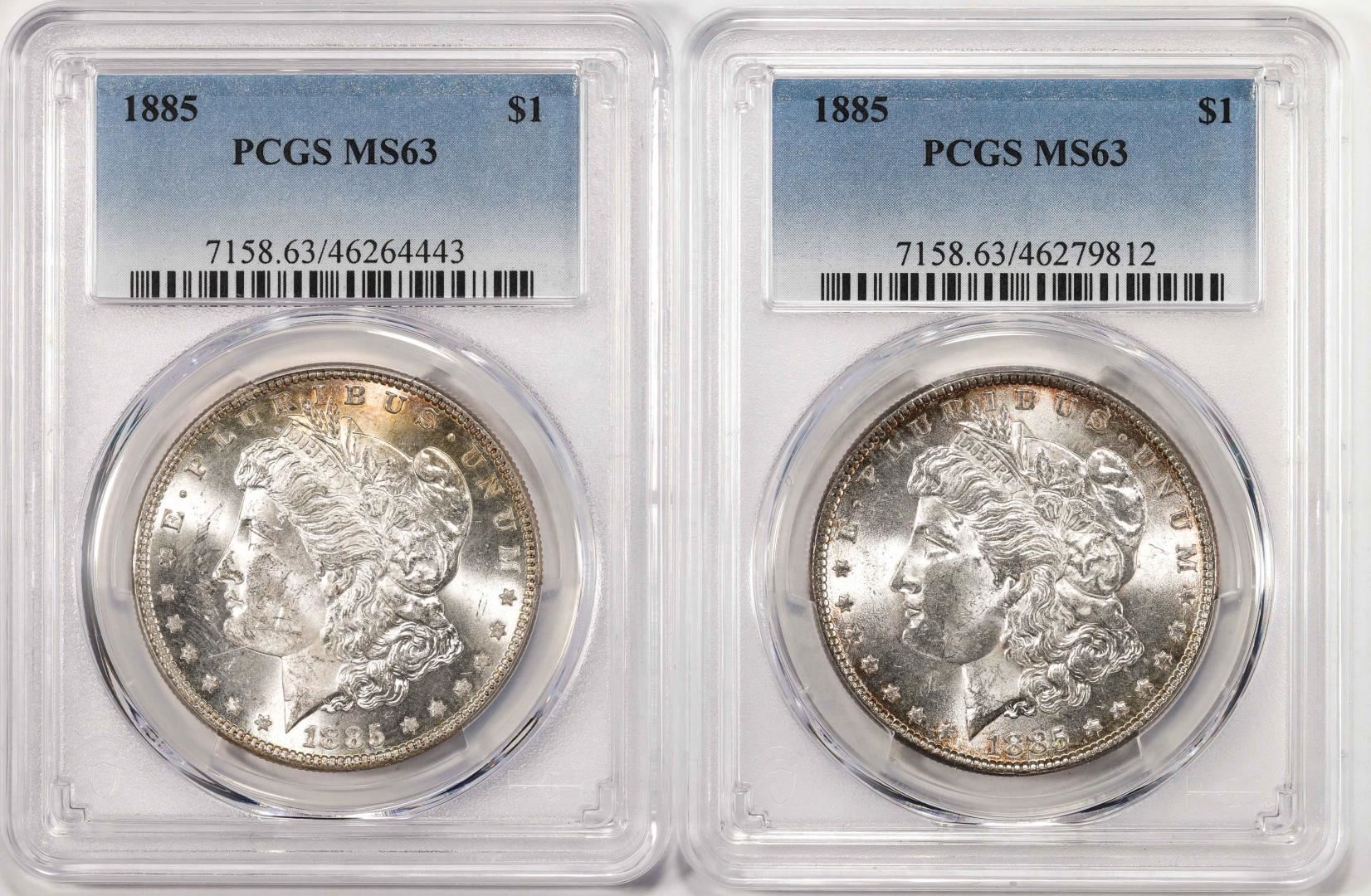 One Lot of (2) 1885 $1 Morgan Silver Dollar Coins PCGS MS63. PCGS Graded.