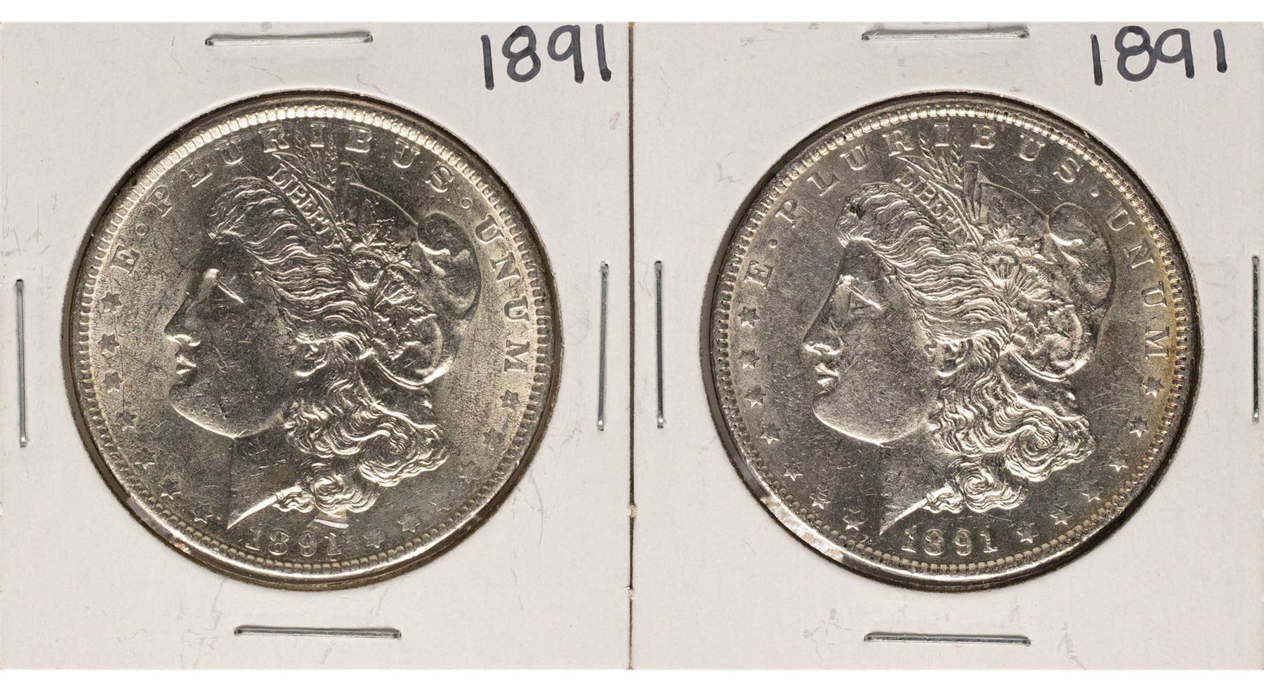 One Lot of (2) 1891 $1 Morgan Silver Dollar Coins.