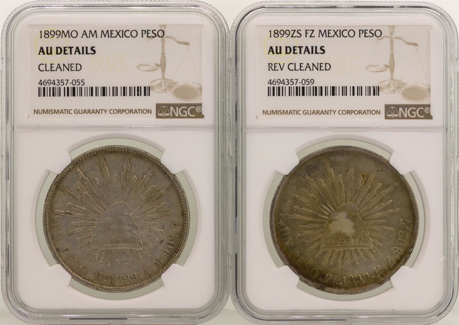 One Lot of (2) 1899 Mexico Pesos Silver Coins NGC Graded AU Details. NGC Certified.