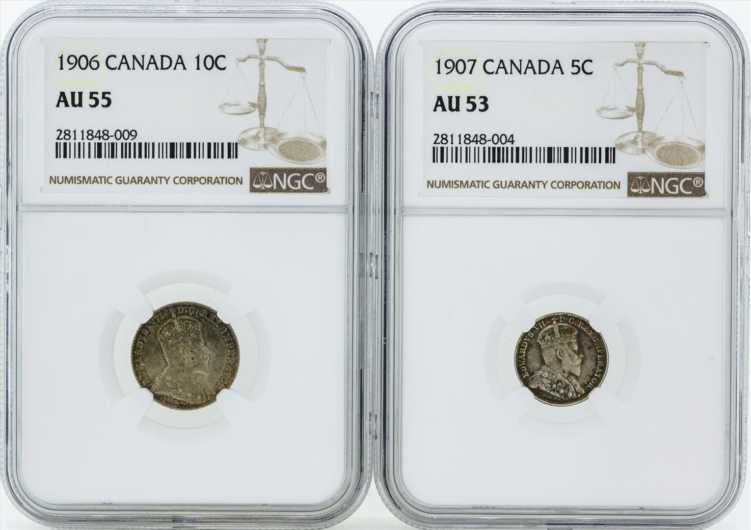 Lot of (2) 1906 Canada 10 Cent Coin NGC AU55 and 1907 Canada 5 Cent Coin NGC AU5