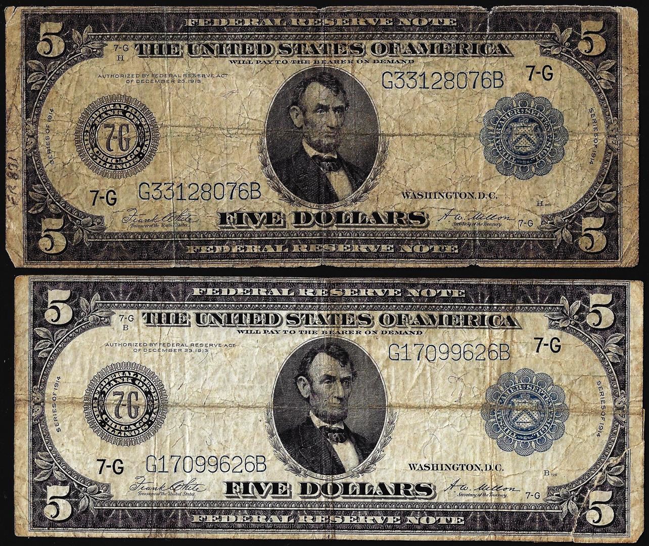 Lot of (2) 1914 $5 Federal Reserve Bank Notes Chicago