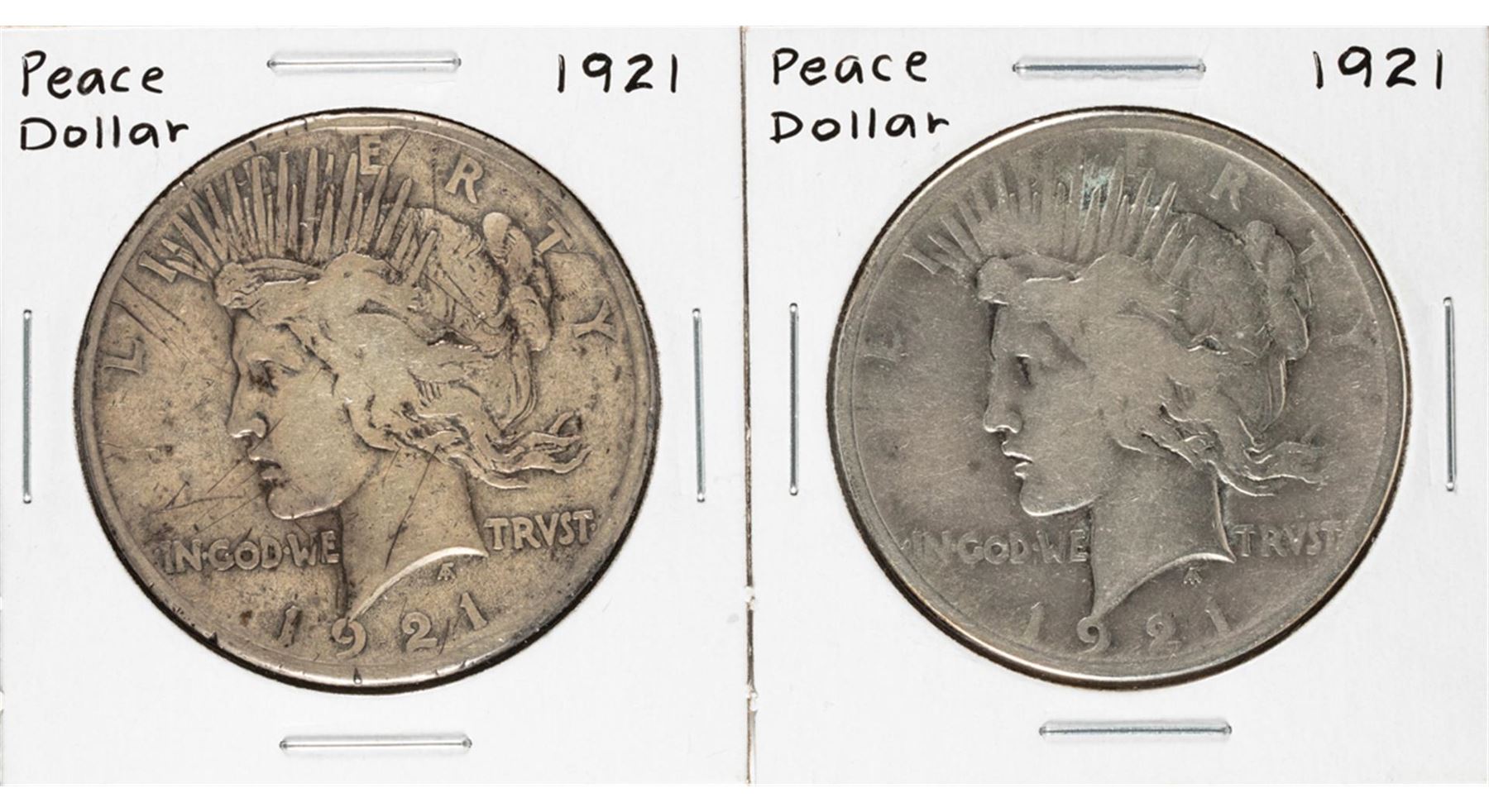 One Lot of (2) 1921 $1 Peace Silver Dollar Coins.