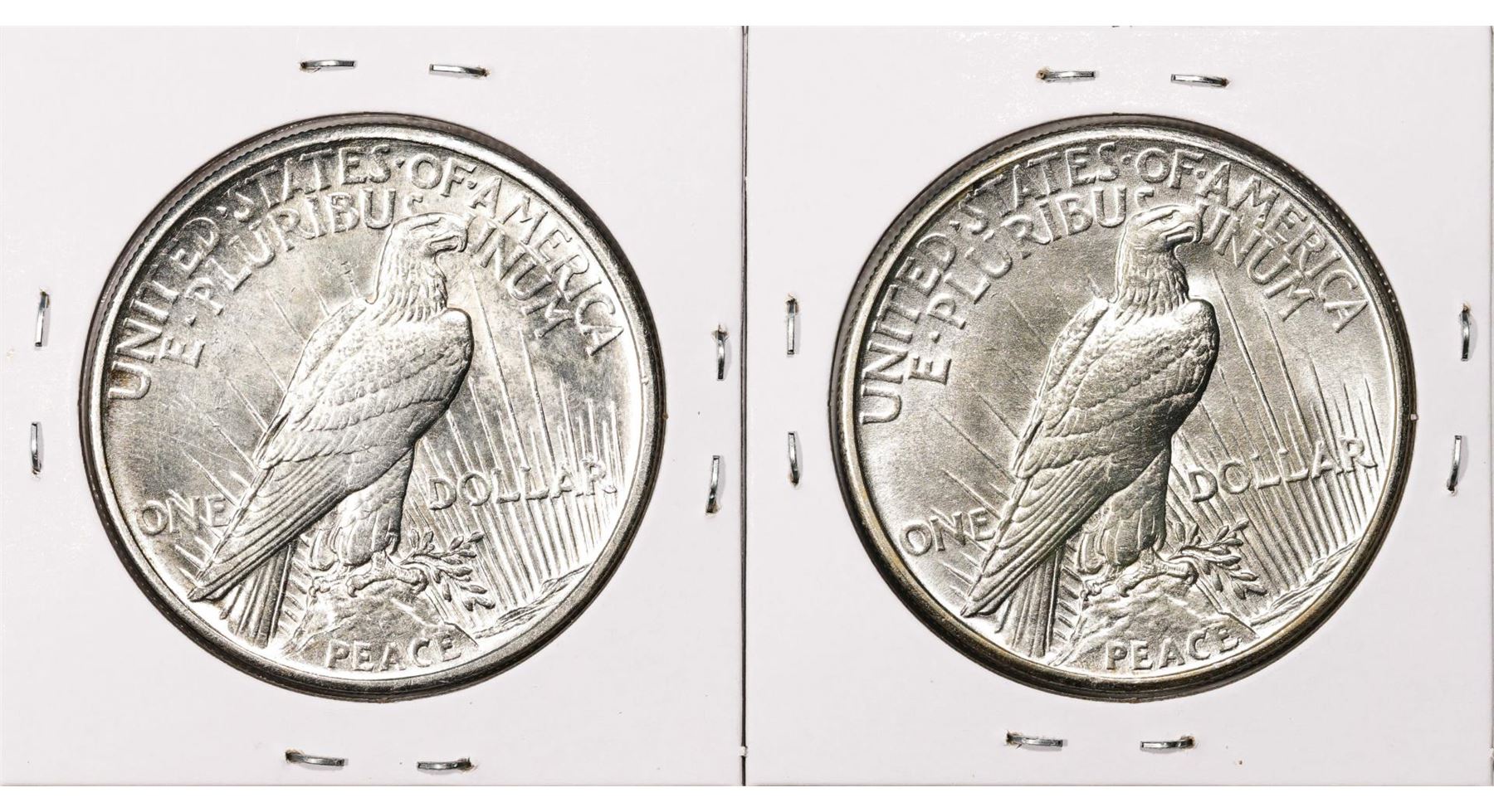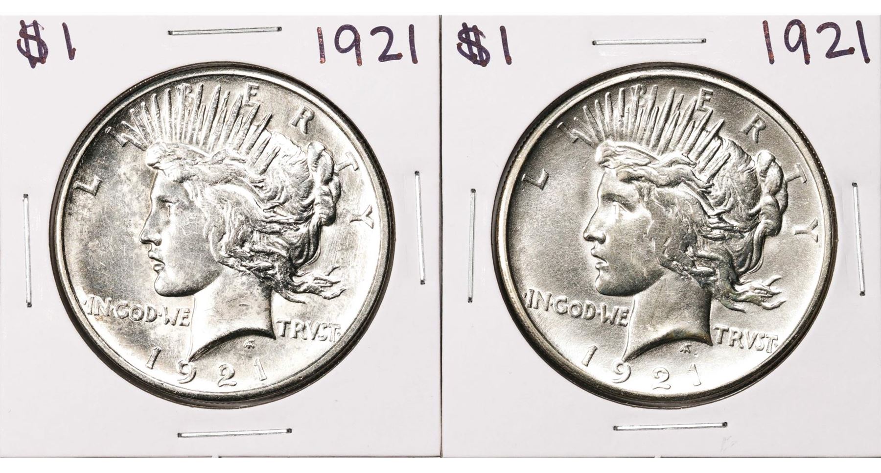 One Lot of (2) 1921 $1 Peace Silver Dollar Coins.