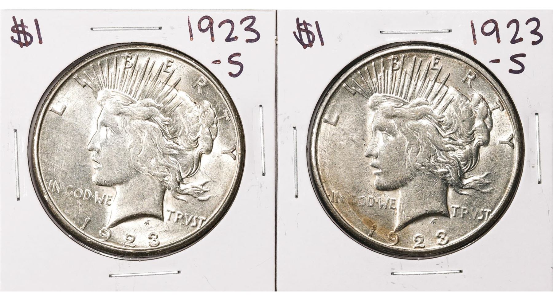One Lot of (2) 1923-S $1 Peace Silver Dollar Coins.