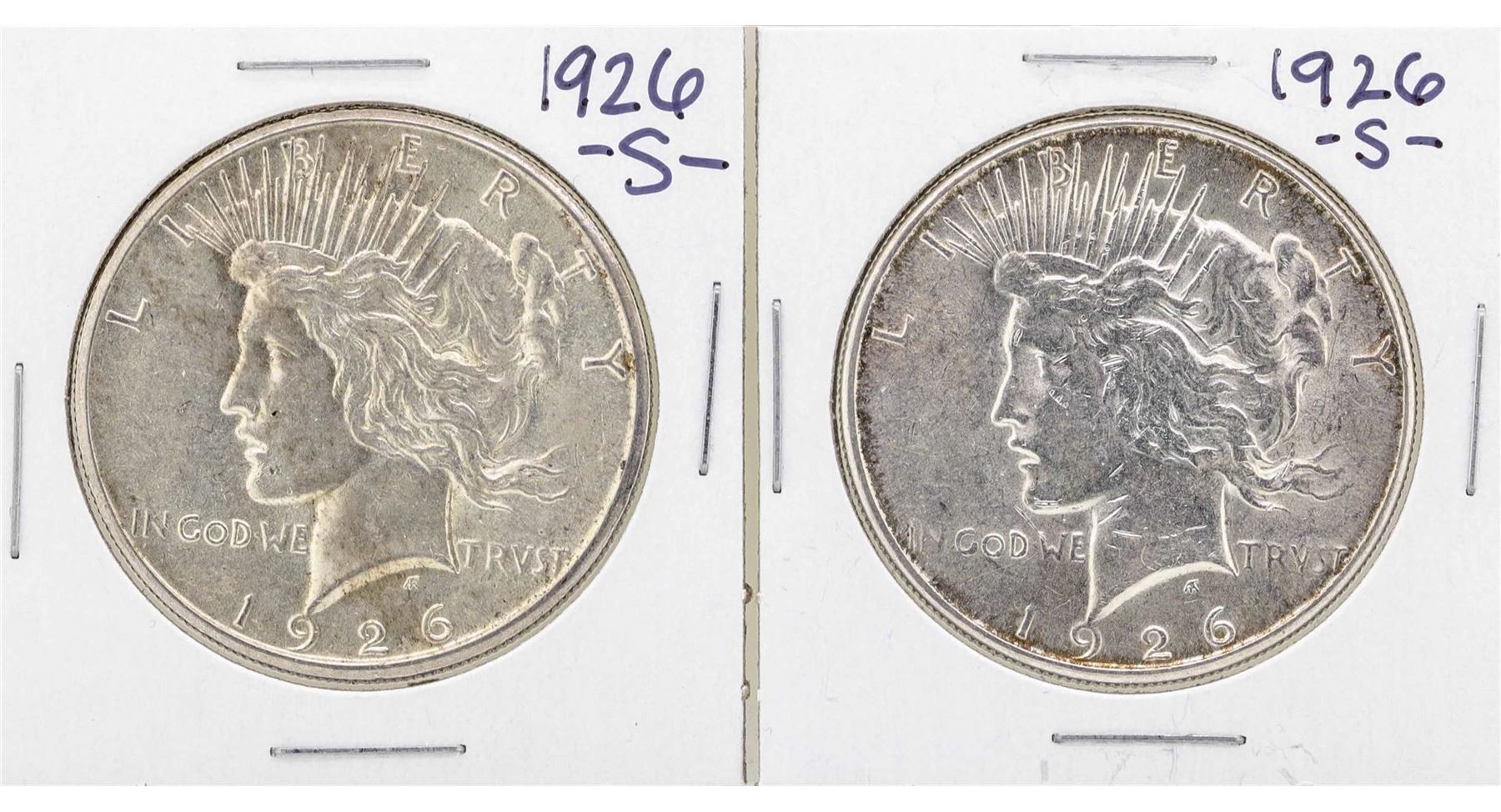 One Lot of (2) 1926-S $1 Peace Silver Dollar Coins.
