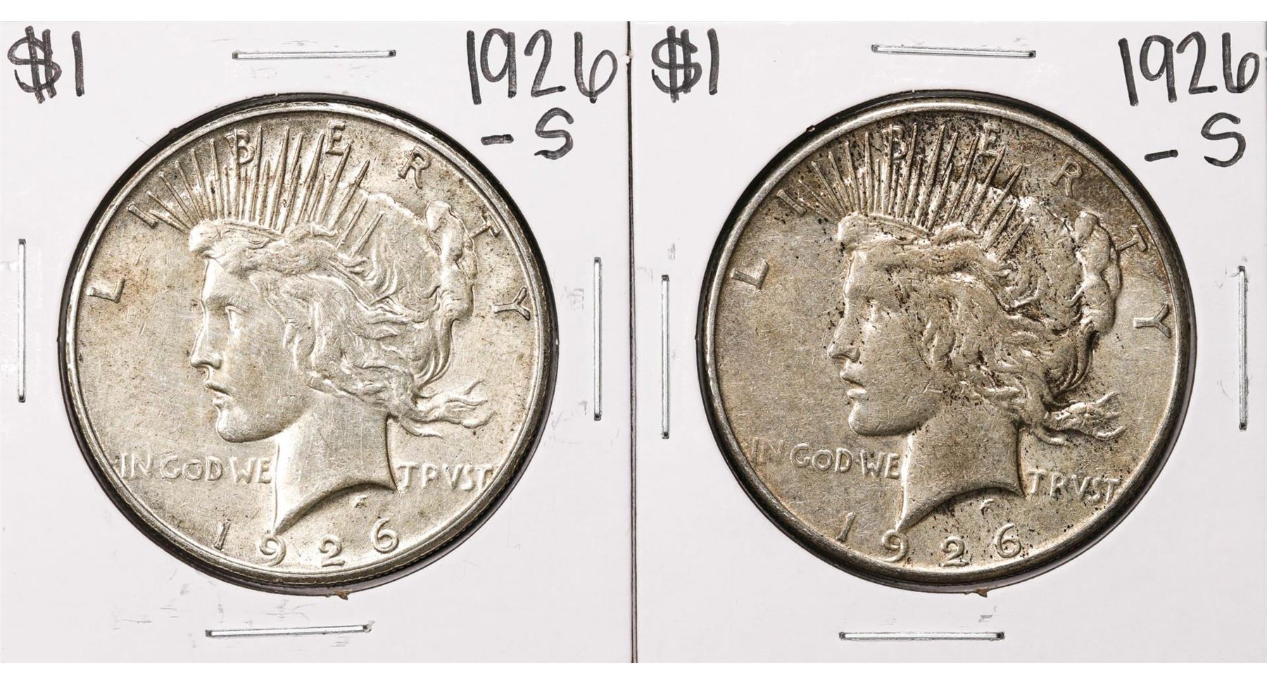 One Lot of (2) 1926-S $1 Peace Silver Dollar Coins.