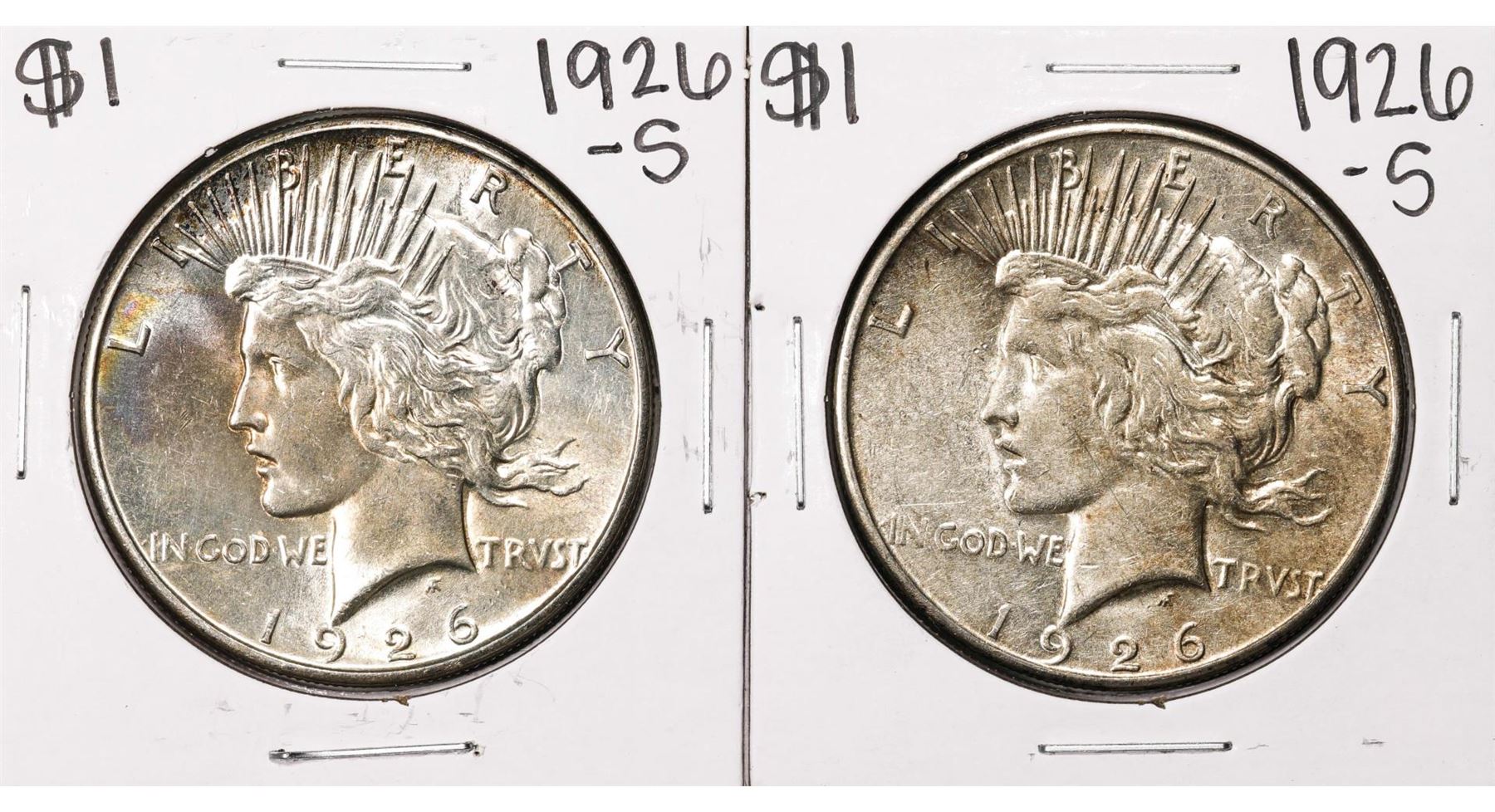 One Lot of (2) 1926-S $1 Peace Silver Dollar Coins.