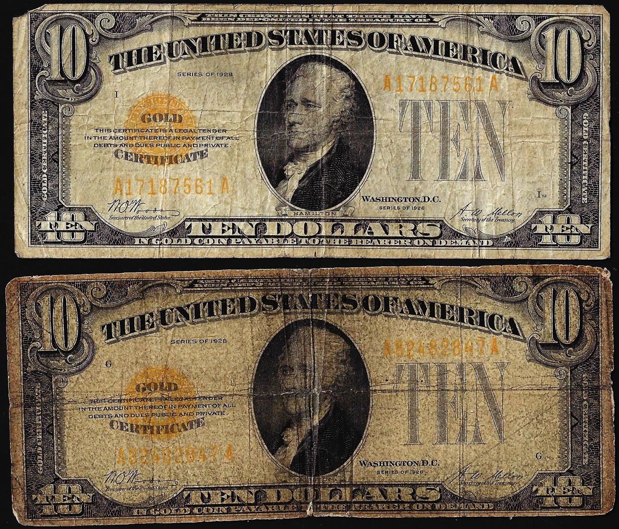 One Lot of (2) 1928 $10 Gold Certificate Notes.