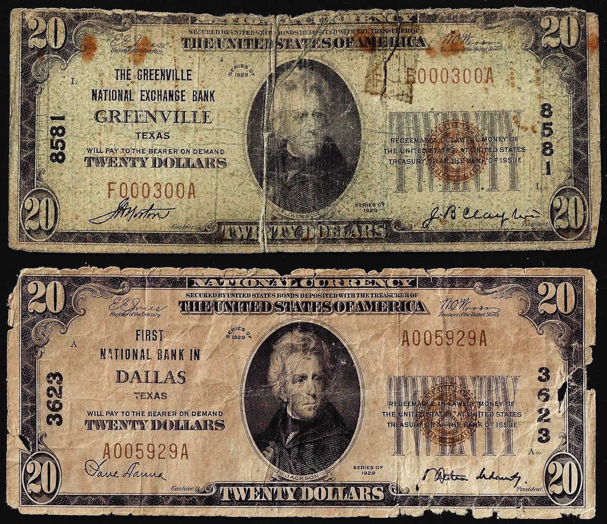 Lot of (2) 1929 $20 Dallas & Greenville, Texas CH# 8581/3623 National Currency Notes
