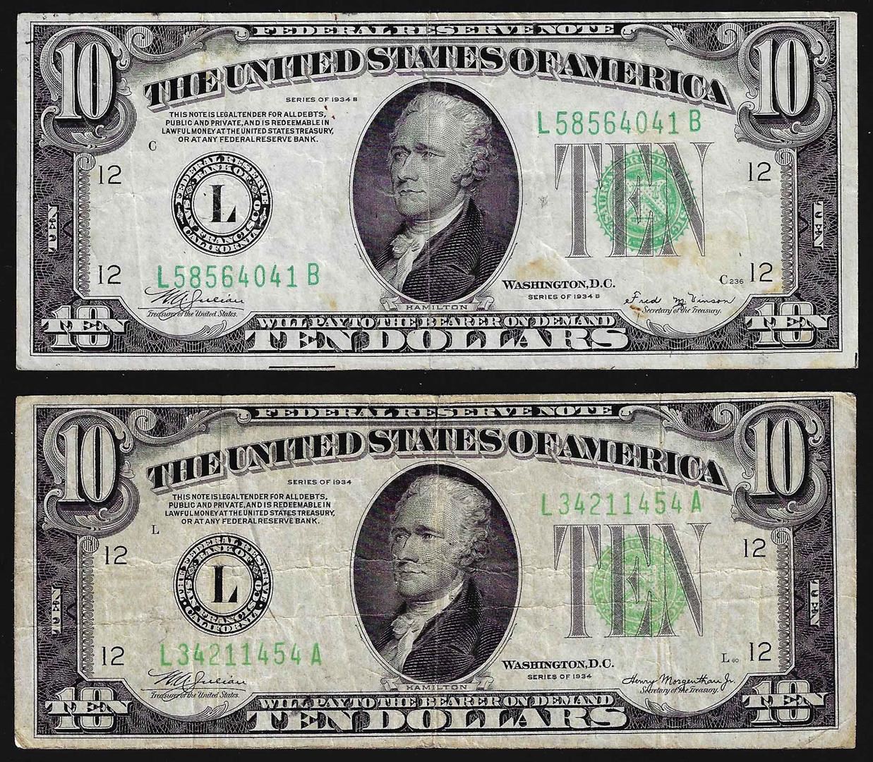 One Lot of (2) 1934 $10 Federal Reserve Notes.