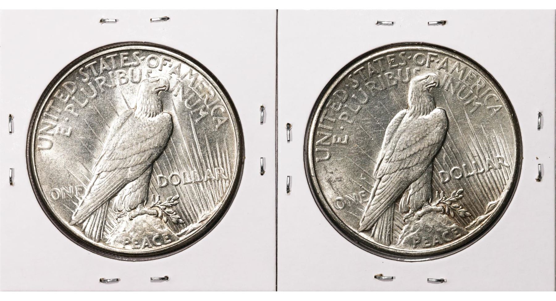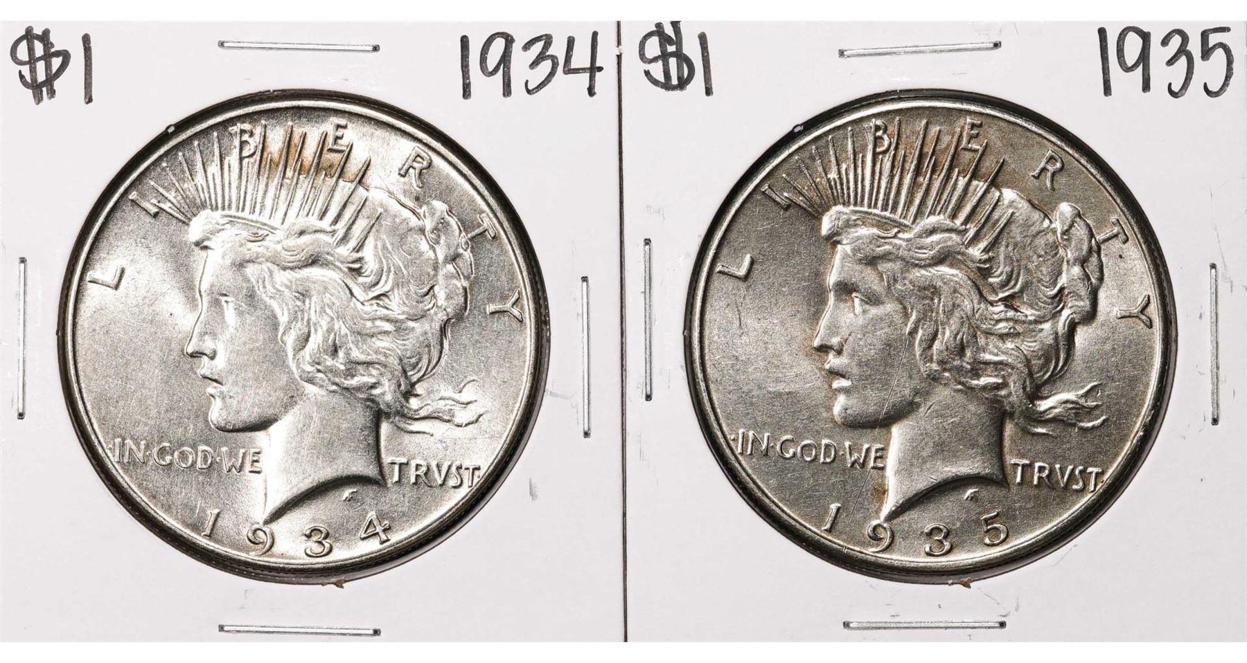 One Lot of (2) 1934-1935 $1 Peace Silver Dollar Coins.