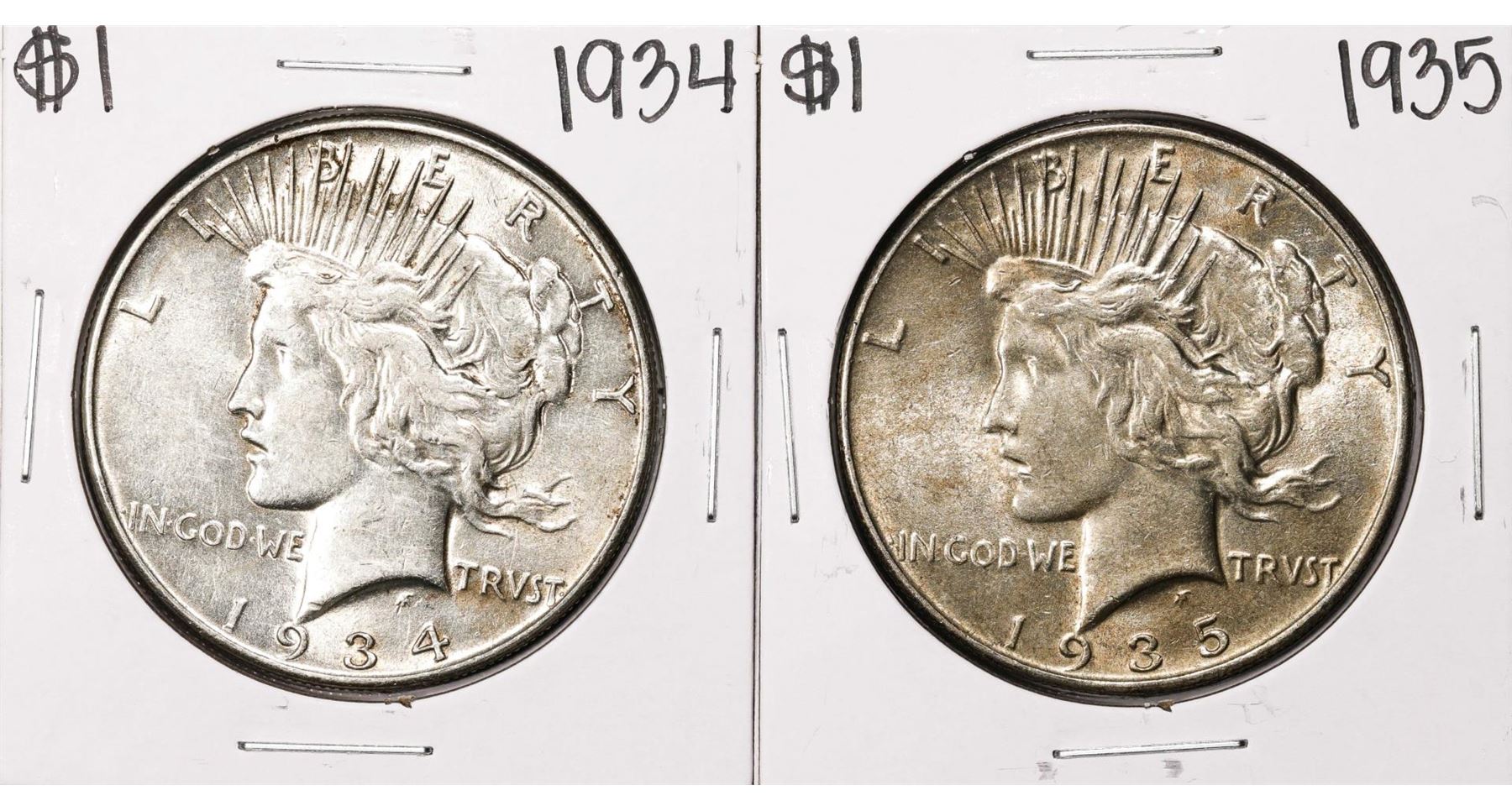 One Lot of (2) 1934-1935 $1 Peace Silver Dollar Coins.