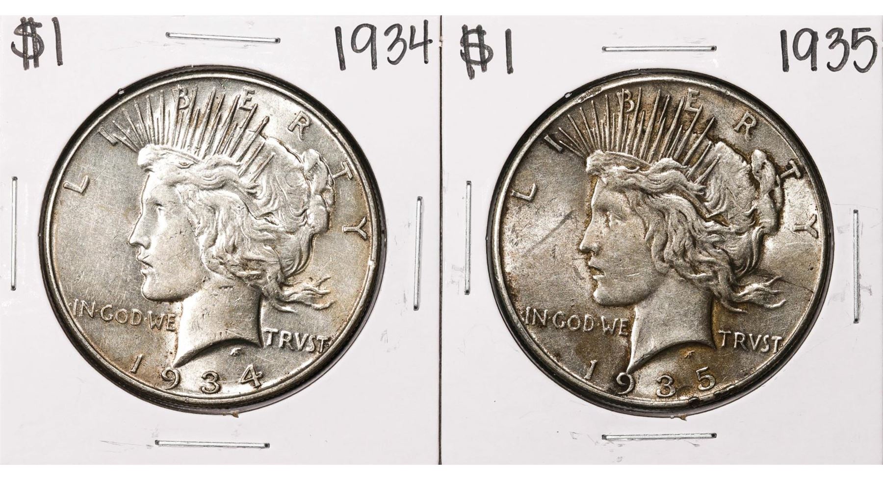 One Lot of (2) 1934-1935 $1 Peace Silver Dollar Coins.