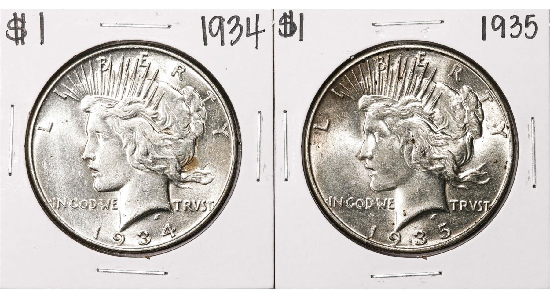 One Lot of (2) 1934-1935 $1 Peace Silver Dollar Coins.