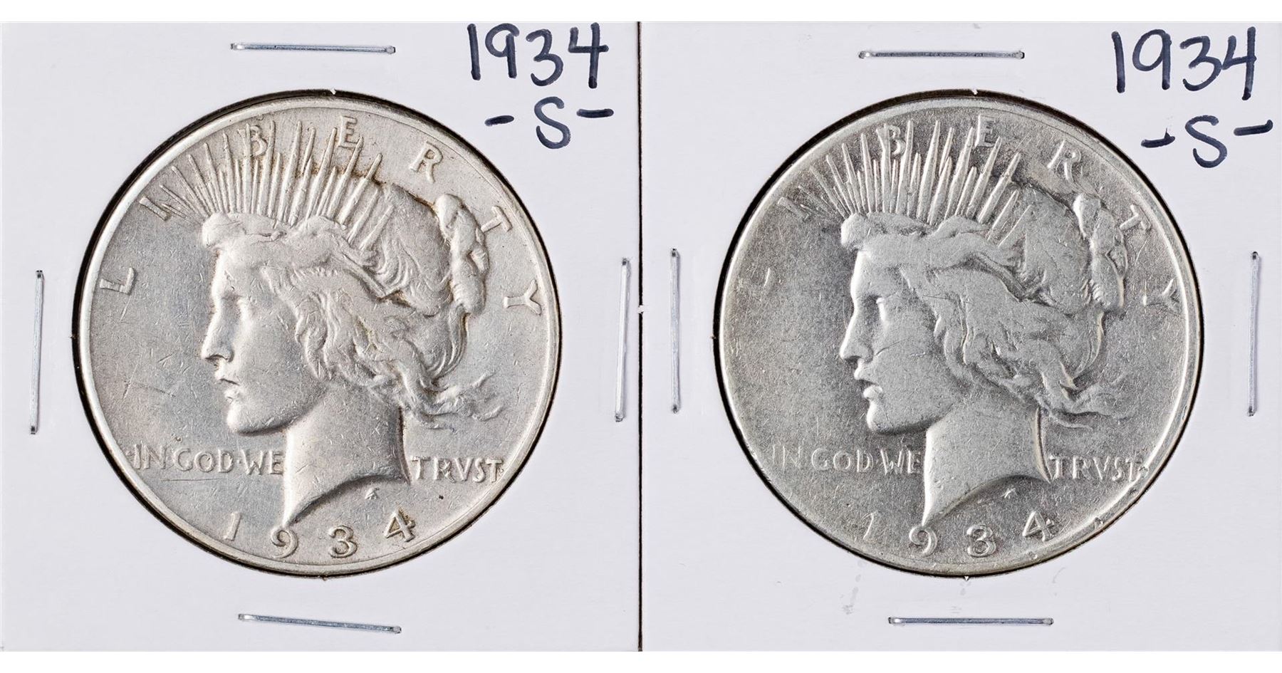 One Lot of (2) 1934-S $1 Peace Silver Dollar Coins.