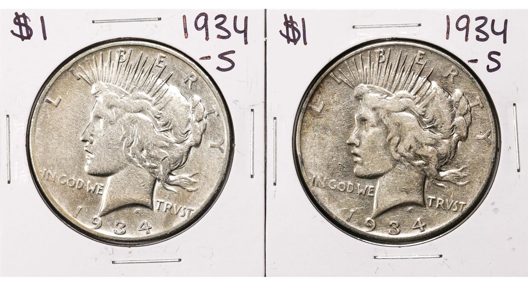 One Lot of (2) 1934-S $1 Peace Silver Dollar Coins.