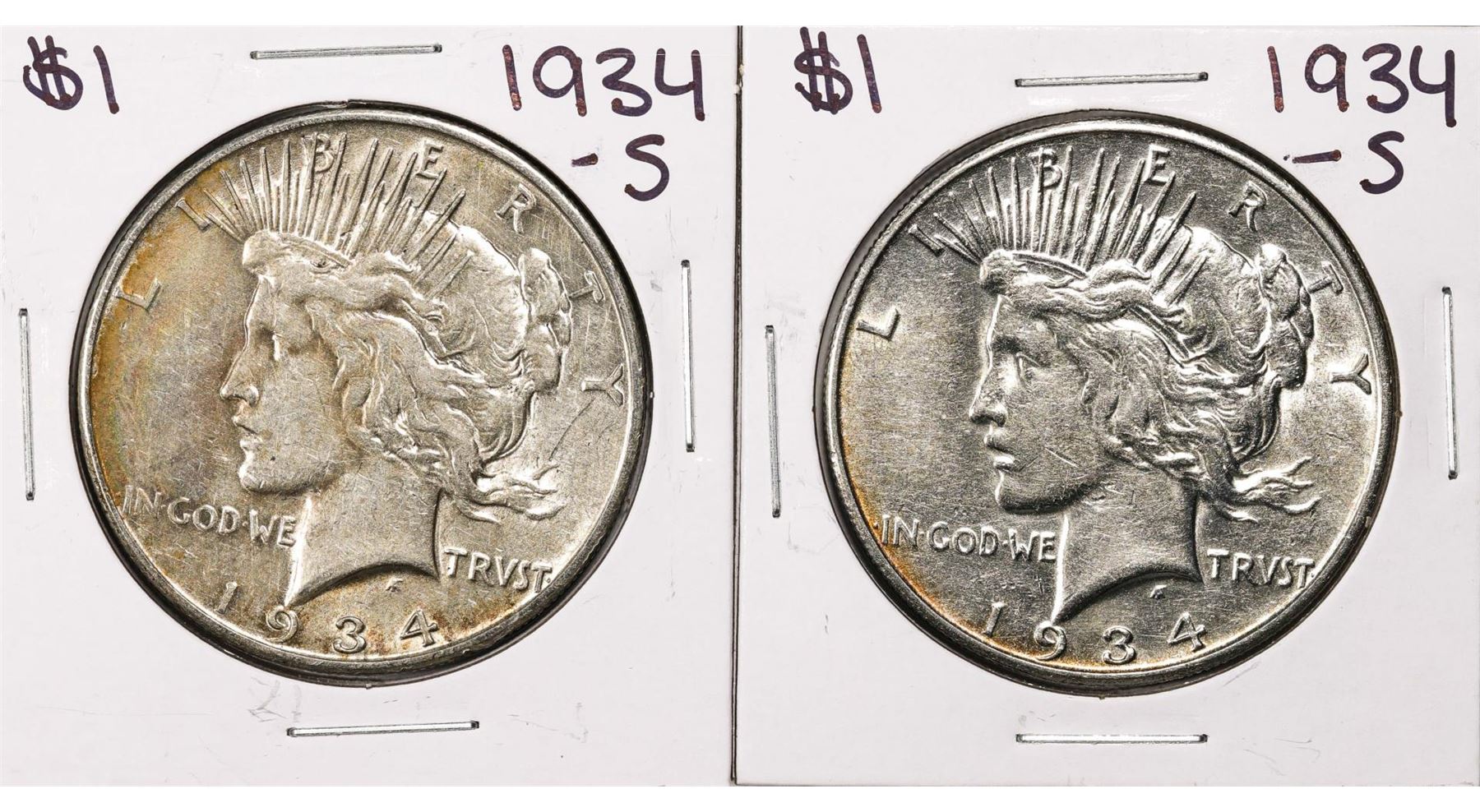 One Lot of (2) 1934-S $1 Peace Silver Dollar Coins.