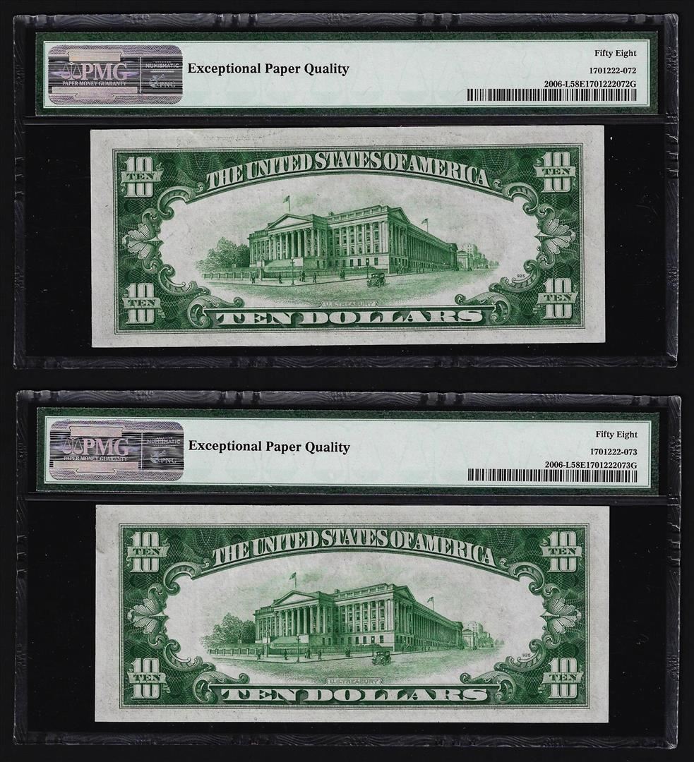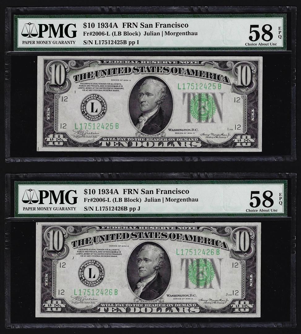 One Lot of (2) 1934A $10 Federal Reserve Note San Francisco PMG Choice About Unc 58EPQ. PMG Certified.