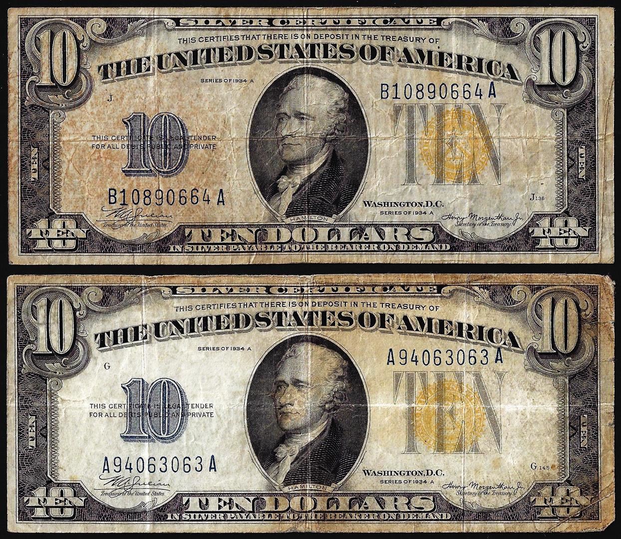 One Lot of (2) 1934A $10 North Africa WWII Emergency Issue Silver Certificate Notes.