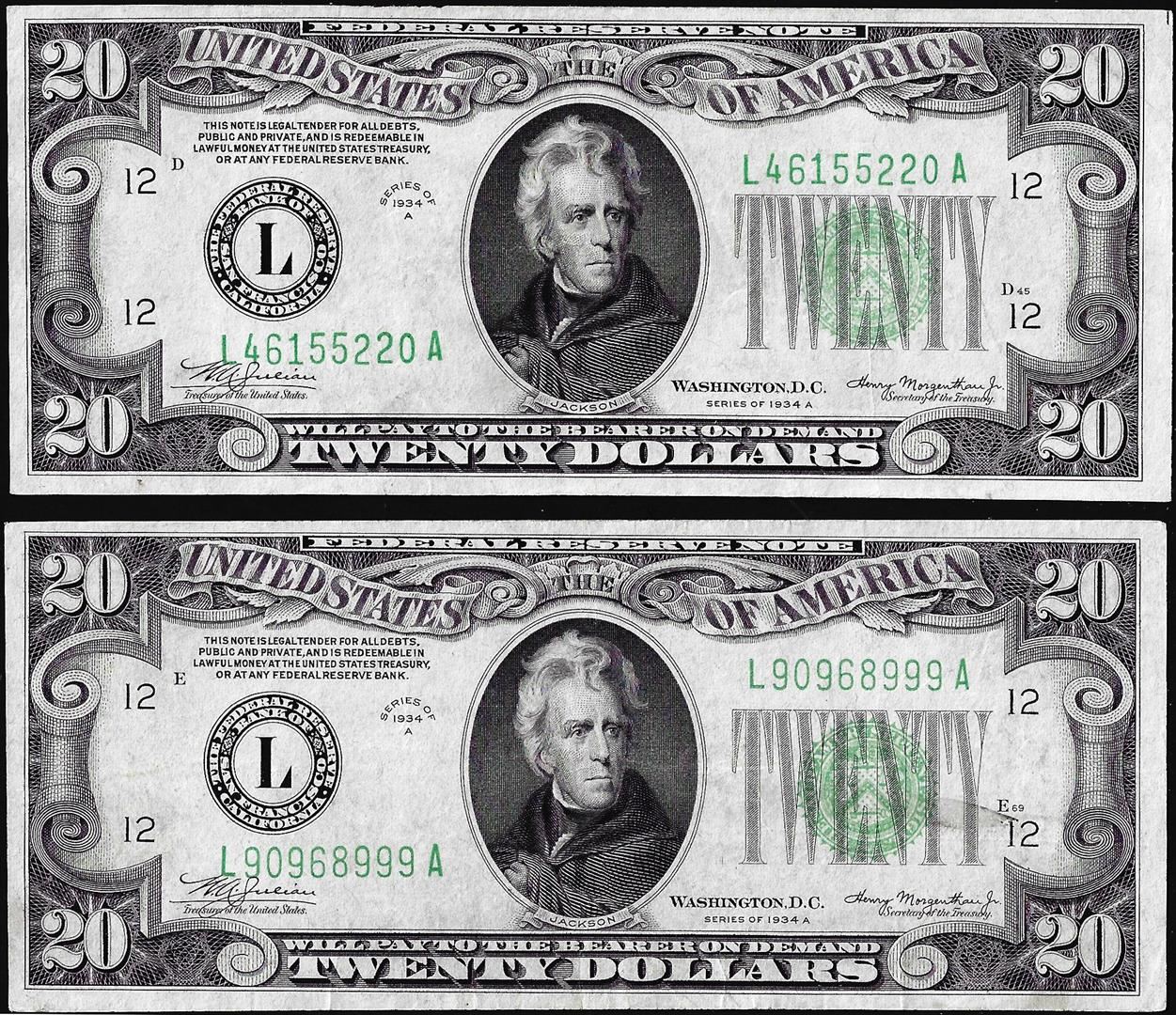One Lot of (2) 1934A $20 Federal Reserve Notes San Francisco.