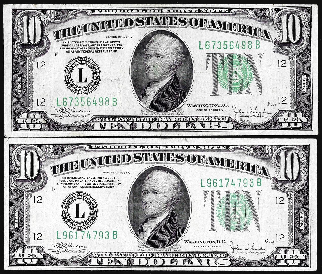 One Lot of (2) 1934C $10 Federal Reserve Notes San Francisco.