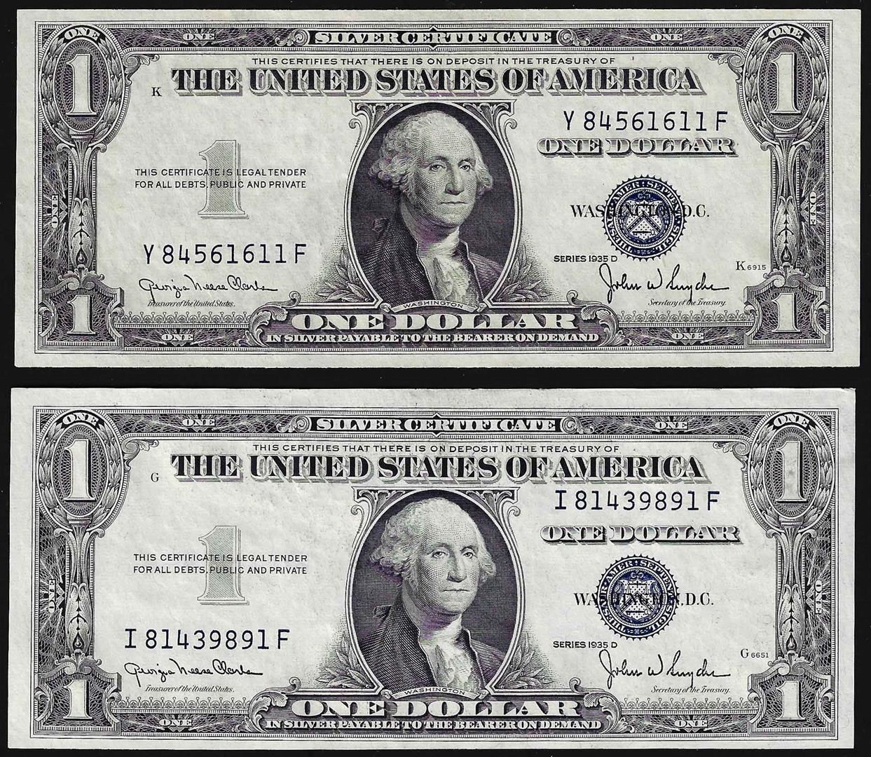 One Lot of (2) 1935D $1 Silver Certificate Notes Narrow Uncirculated.