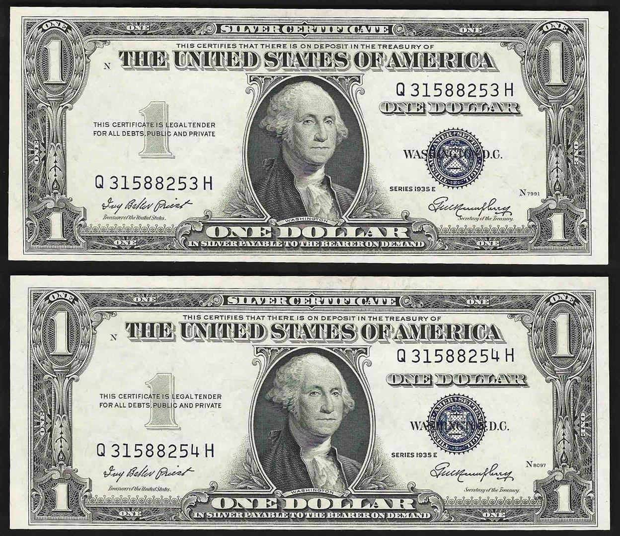 One Lot of (2) 1935E Consecutive $1 Silver Certificate Notes Uncirculated.