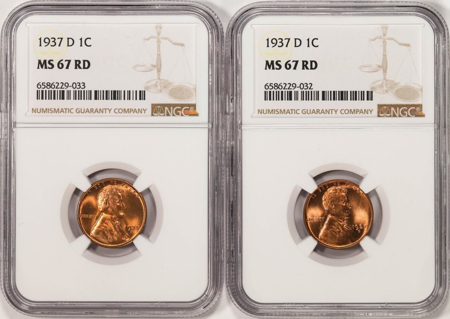 One Lot of (2) 1937-D Lincoln Wheat Cent Coins NGC MS67RD. NGC Certified.
