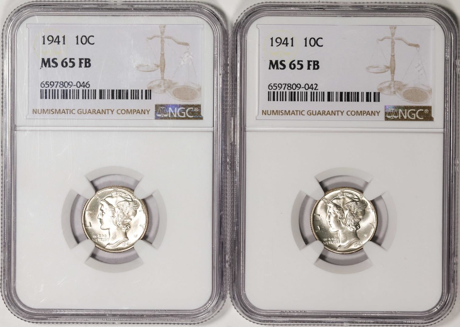 One Lot of (2) 1941 Mercury Dime Coins NGC MS65FB. NGC Certified.