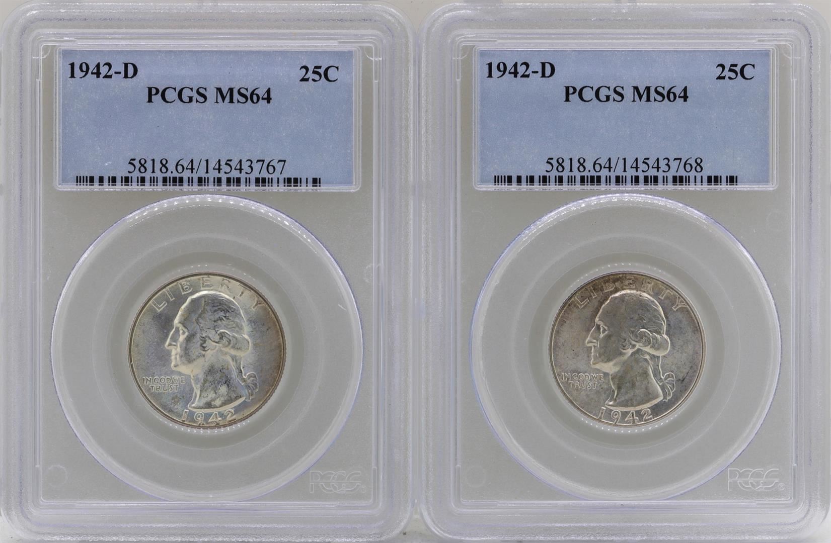 One Lot of (2) 1942-D Washington Quarter Coins PCGS MS64. PCGS Graded.