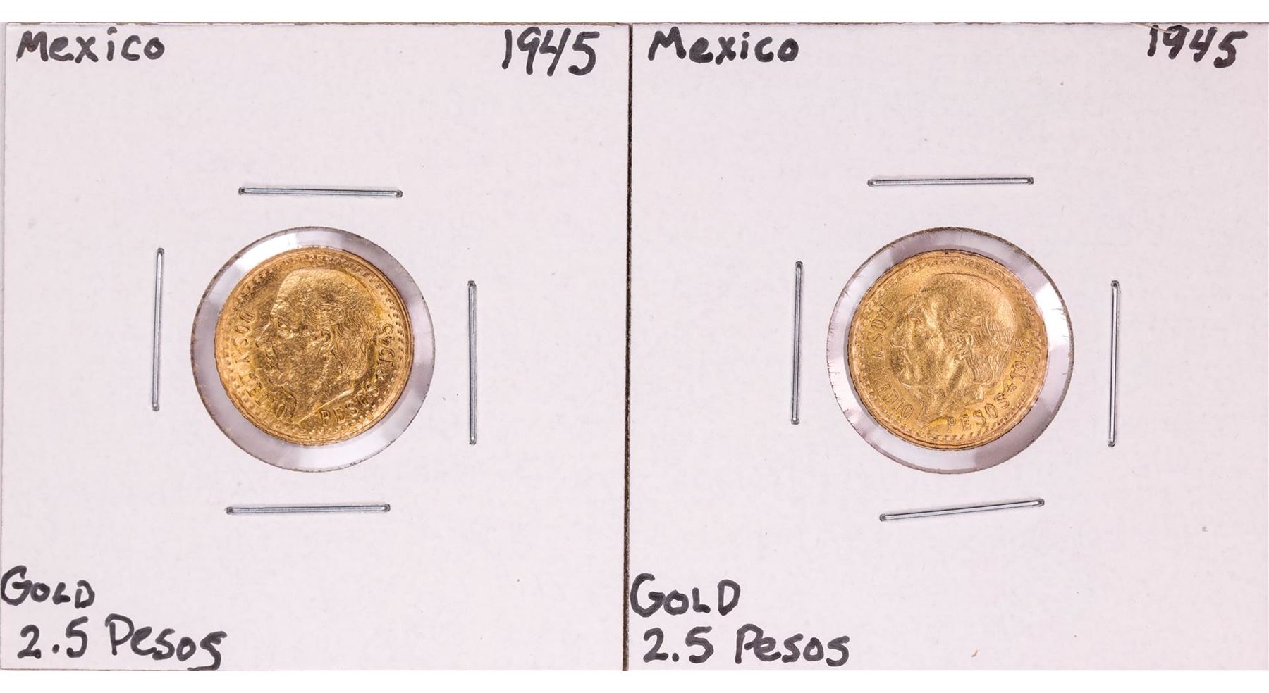 One Lot of (2) 1945 Mexico 2.5 Pesos Gold Coins.
