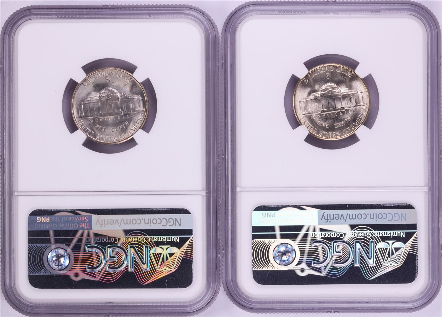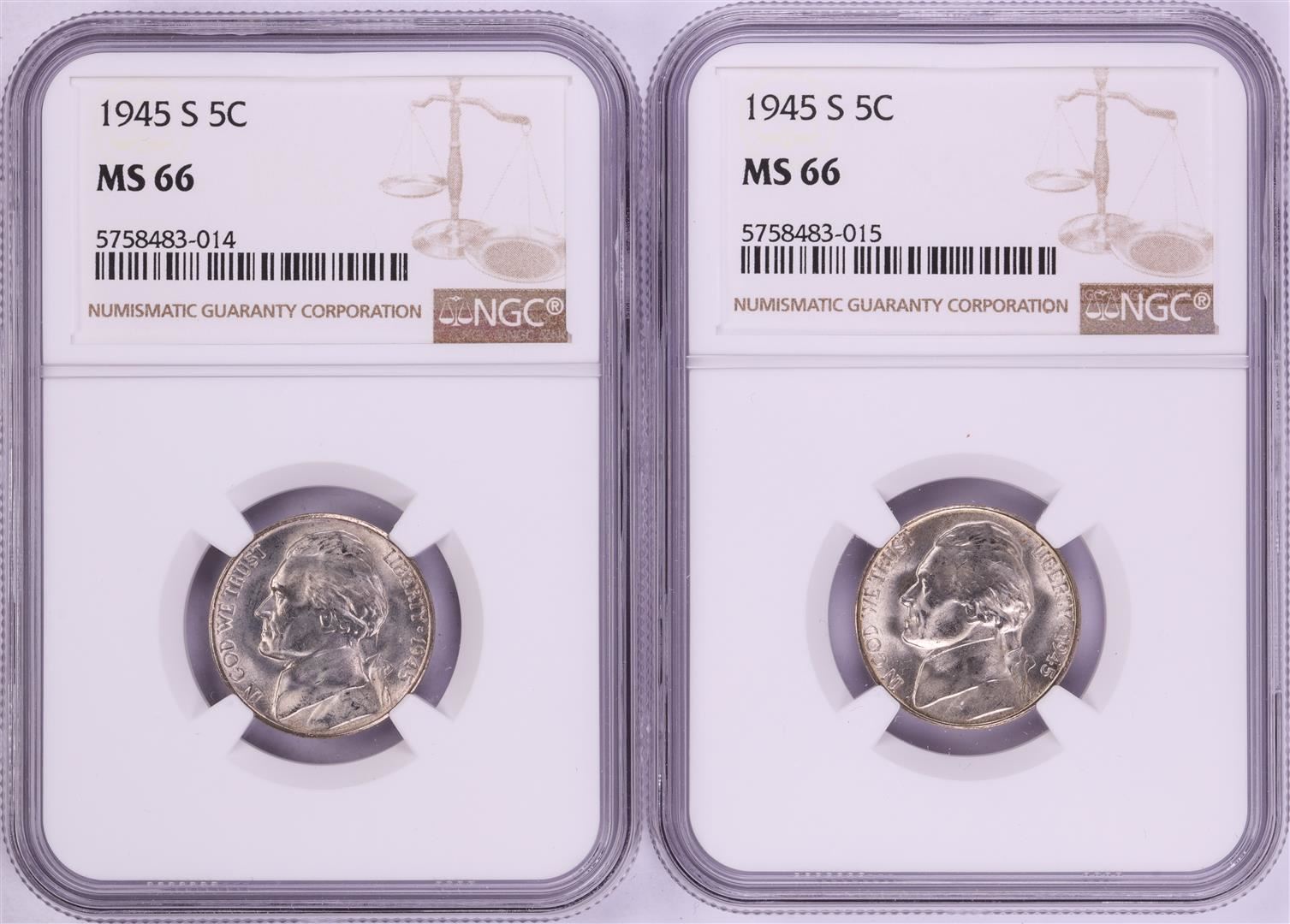 Lot of (2) 1945-S Jefferson Wartime Silver Nickel Coins NGC MS66