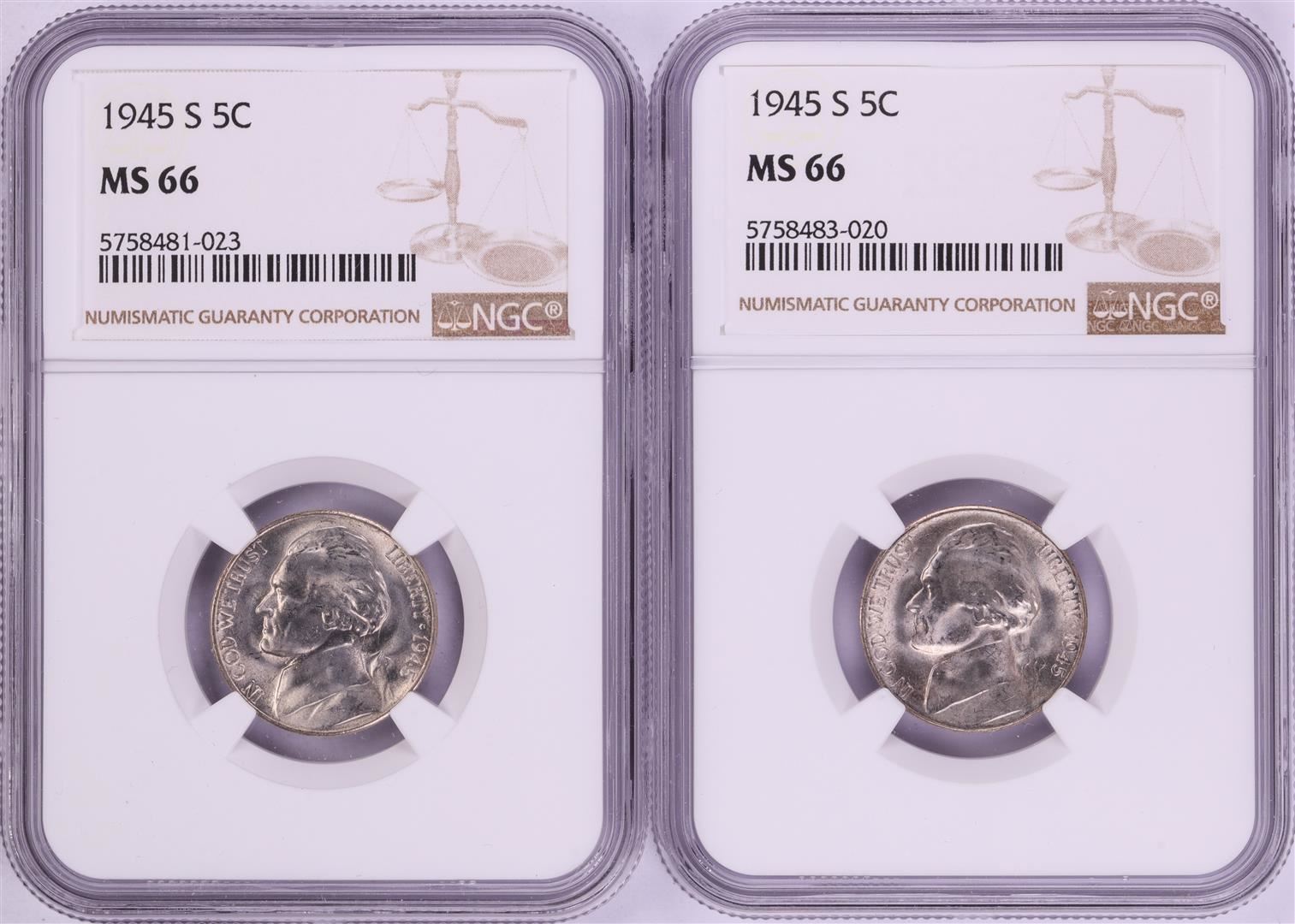 Lot of (2) 1945-S Jefferson Wartime Silver Nickel Coins NGC MS66