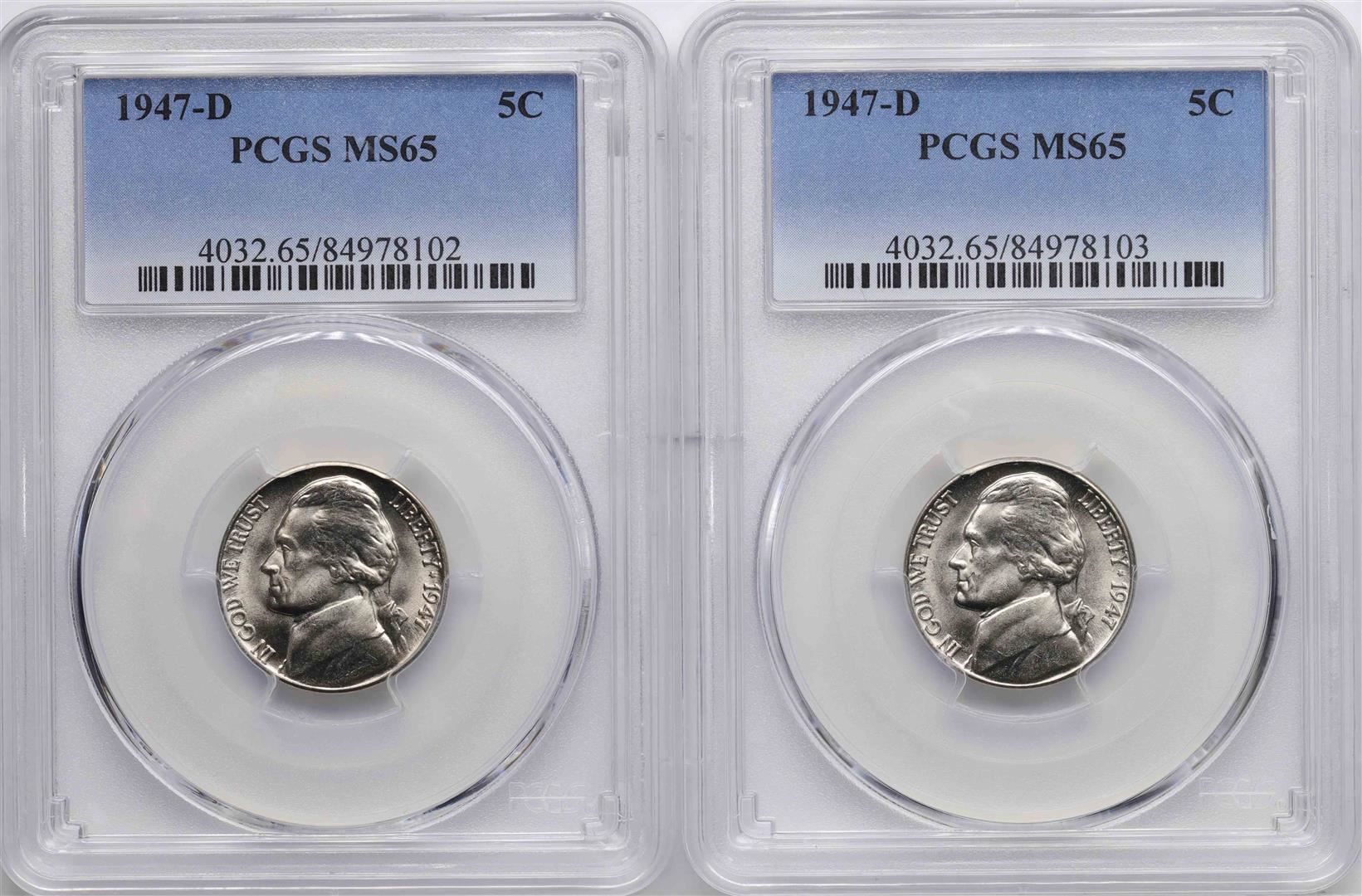One Lot of (2) 1947-D Jefferson Nickel Coins PCGS MS65. PCGS Graded.