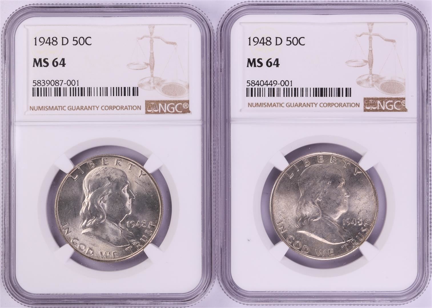 Lot of (2) 1948-D Franklin Half Dollar Coins NGC MS64