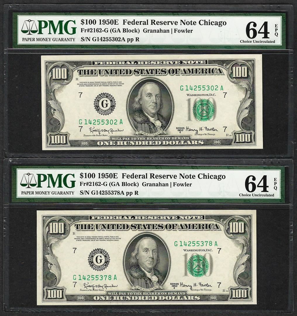 One Lot of (2) 1950E $100 Federal Reserve Notes Chicago PMG Choice Uncirculated 64EPQ. PMG Certified.