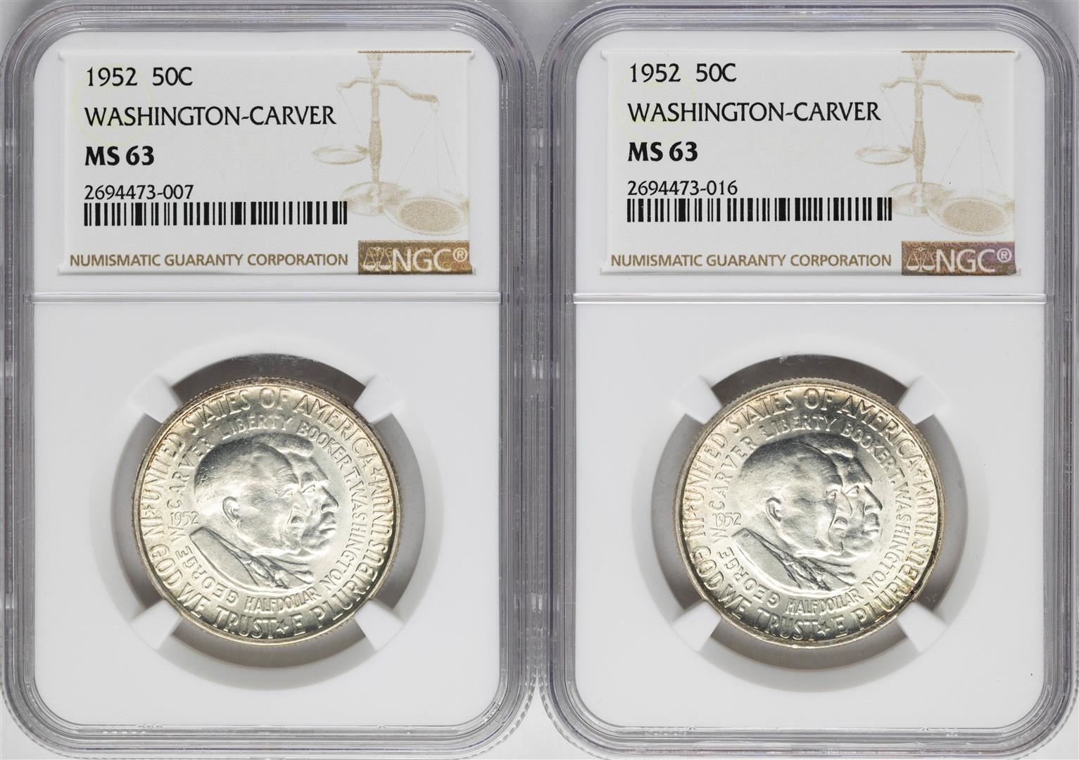 One Lot of (2) 1952 Washington-Carver Commemorative Half Dollar Coins NGC MS63. NGC Certified.